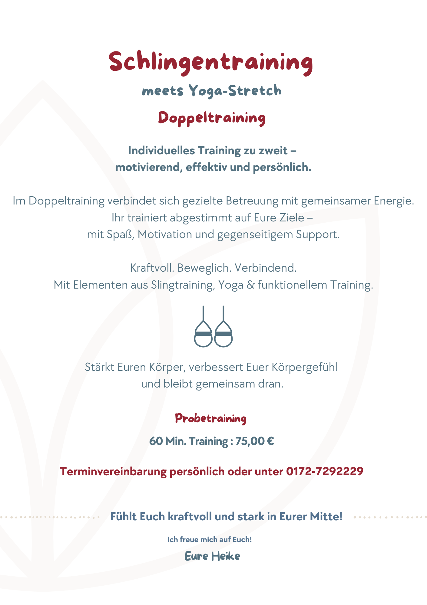 Das Training ist individuell anpassbar und eignet sich für Einsteiger ebenso wie für Fortgeschrittene. Du bestimmst die Intensität. Dein Körper zeigt den Weg.